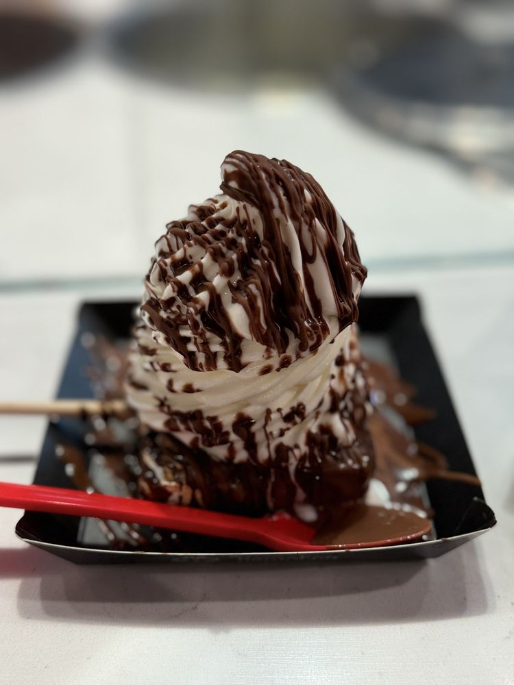 Vanilla chocolate twist ice cream with mini chocolate chips, gourmet chocolate sauce, pure dark chocolate